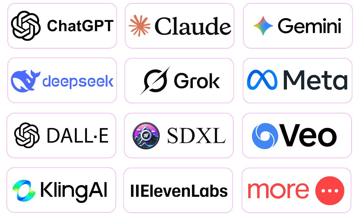 GPT, Claude, Gemini, Grok, DALL·E, Veo, Kling & more.